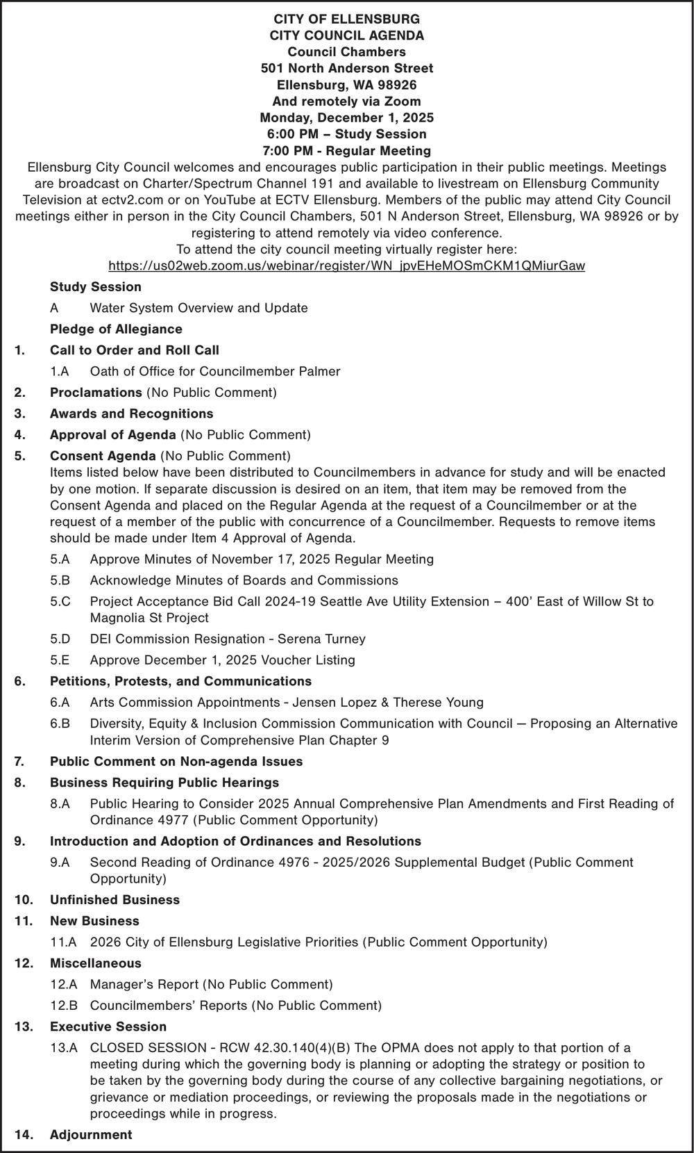 Nov 28, 2025. City of Ellensburg Government Ads from Daily Record