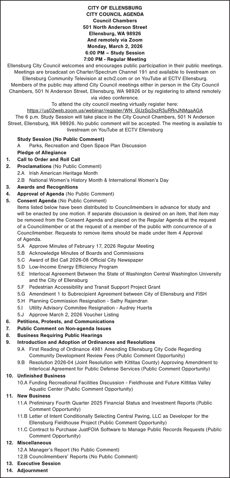 Feb 27, 2026. City of Ellensburg Government Ads from Daily Record